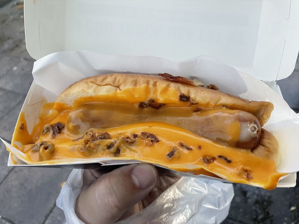 あてはホットドッグ。ブローウィンズの会場にも来ていたホットドッグ屋さんが来ていたのでリピートで買いました。購入した時は雨が降っててビールをもって傘を持ってだったのですが、食べづらかったです。フォーク欲しいねw味はめっちゃくちゃ美味い♪食べづらかったけど、また次会見かけたら買っちゃうと思います