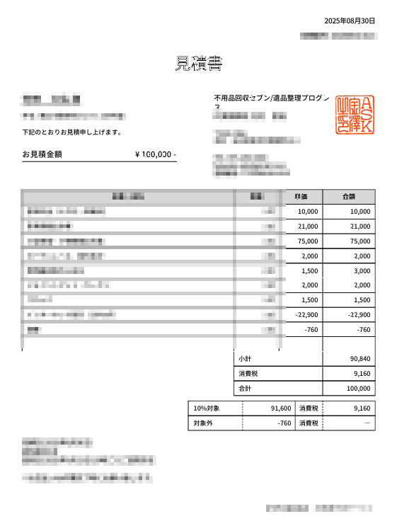 なんと。ジャスト10万ほど(;´・ω・)予想以上に高額でビビりました。当初は3万くらいだろうと予想しており、何も考えず全部引き取ってもらって楽をしようと思ってたんだけど、予定変更を余儀なくされました。