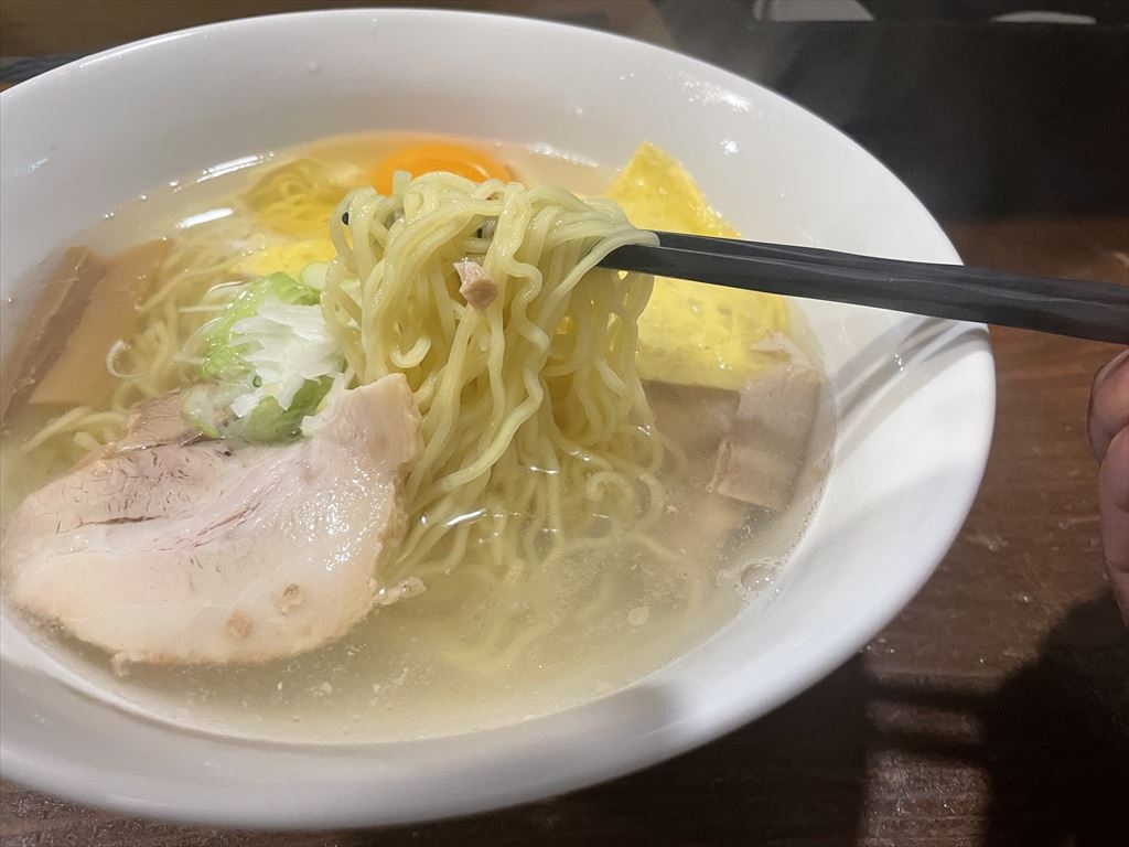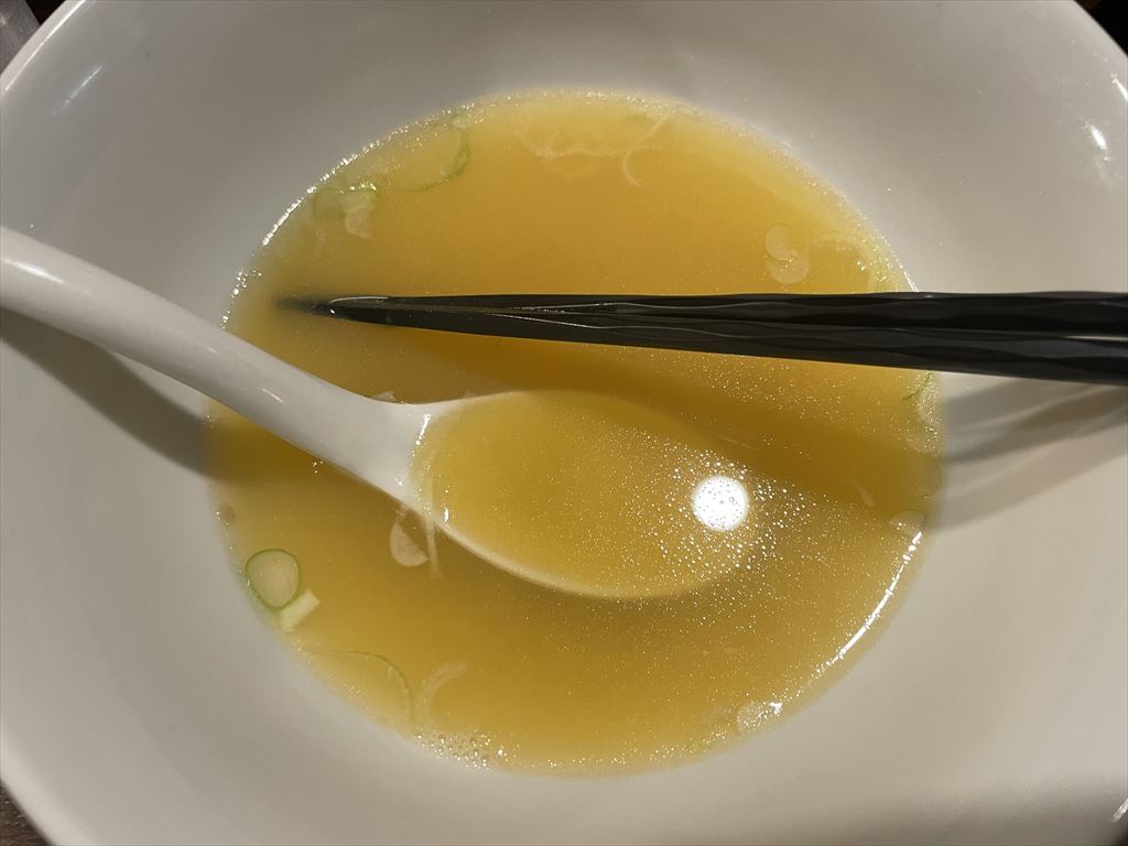 すごい綺麗なスープですよね。そのビジュアルに驚きました。で、肝心のスープの味。一口飲んだ感想は「優しい」のひとこと。塩なんだけど絶妙な塩加減で、塩辛さを微塵にも感じない