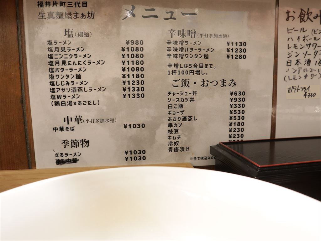 まぁ坊らーめん。めちゃくちゃ美味いそうです。これまで〆のラーメンと言えば「いちろくらーめん」一択でしたが、新しい選択肢としての期待感もあり初訪問。息子さんとそのお母さんとの2人運営。