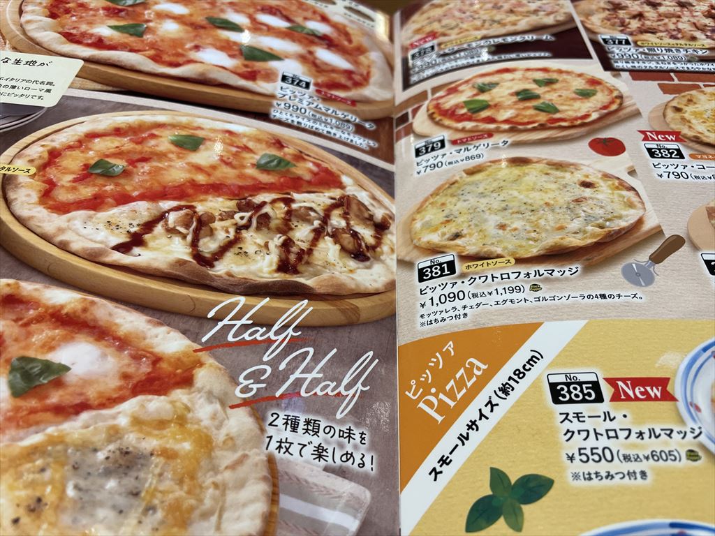 メニューで今日のランチ内容を考えます。目当てはパスタとピザ。その内容とサイズを思考します。思考した結果、カルボナーラとマルゲリータピザになりました。王道最高(笑)