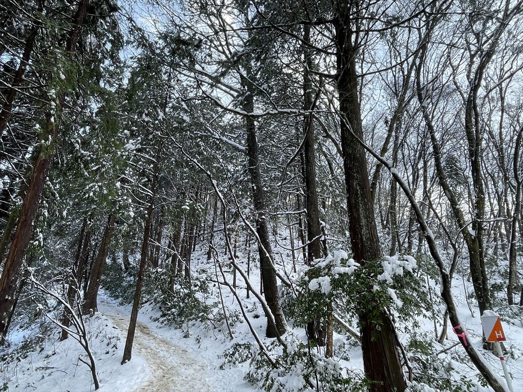 Hポスト分岐。このあたりから雪が増え始め、歩きやすくなりました。ここまではドロドロぐちょぐちょ(;´・ω・)防水のトレッキングシューズとはいえ、慎重に足の置き場を選びながら歩く必要があります。