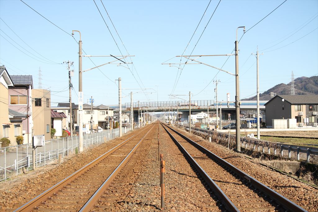 ハピラインの線路を渡り中に1枚。どこまでも続きそうなこの1直線の光景が好きなんだよね。この景色は線路でしか見れない(と、思ってるw)