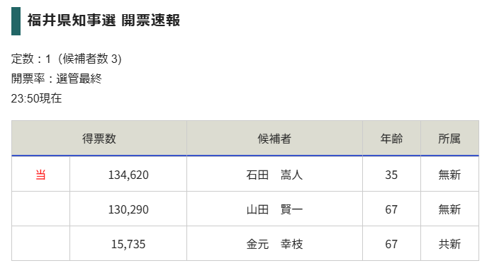 過去の実績から見ての名実ともに山田賢一氏一択かと思ってたんだけど、ふたを開けてみたら「石田嵩人」氏が僅差(4000票差)で勝利し新知事となりました!