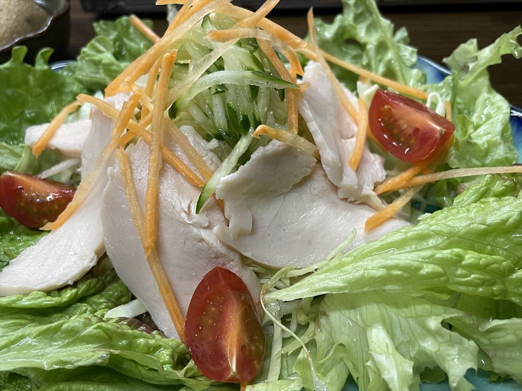 自宅でブロッコリーとか食べてから来た上で、お店に着いてからもまずはむね肉と野菜から。