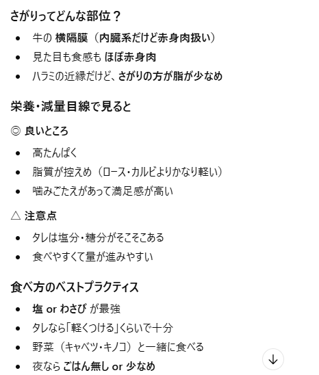 野菜とかでお腹を満たせたあとはお肉タイム。大好物のサガリタワー。じつはこのサガリというお肉。ダイエットにはめちゃくちゃ良いお肉みたいですね。さがりについてGPTに聞いた結果。