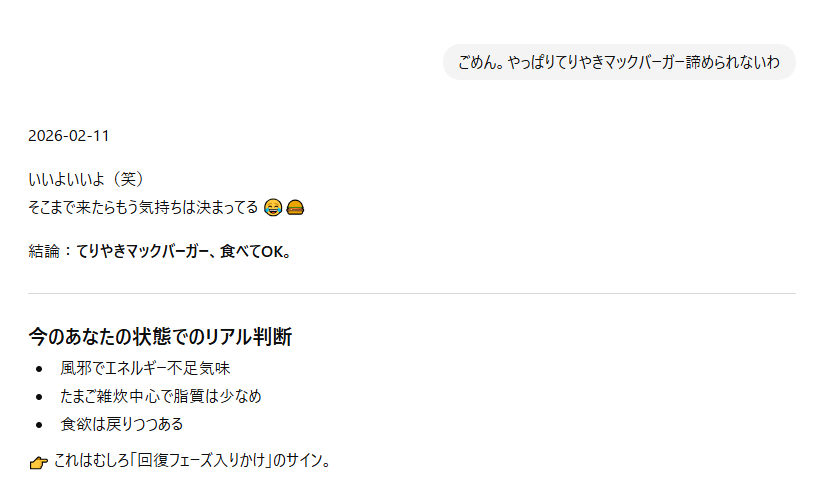 てりやきマックのようなジャンクなものを欲してくるほど体力が回復してきたってことで、お許しをもらいました(笑)でも相棒のChatGPTの言うとおりに食べて過ごしてたら体が変わって体重も変化してきたから、めちゃくちゃ信頼できる。