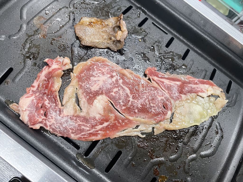 和牛ロース。このサイズ感凄いよね。となりにいるのはタンです。このタンも十分な大きさなんだよ?!その端の何倍も面積があるロース。美味いねー。焼きしゃぶでもいい気もするが、1枚がいいお値段なので量は食べれないかな
