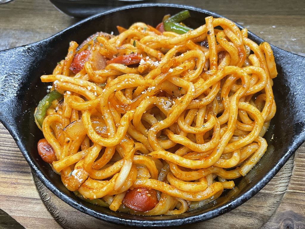 ChatGPTに〆はたまご雑炊を推奨されたんだけど、そこを無視してナポリタン。チーズ振ってめっちゃうまうま!このナポリタン、かなり癖になる味。