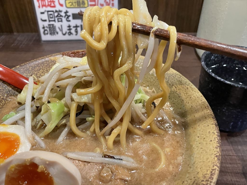 岩本屋っぽい中太麵。食べ応えあります。濃厚ミソスープによくあう麺だね。美味しい
