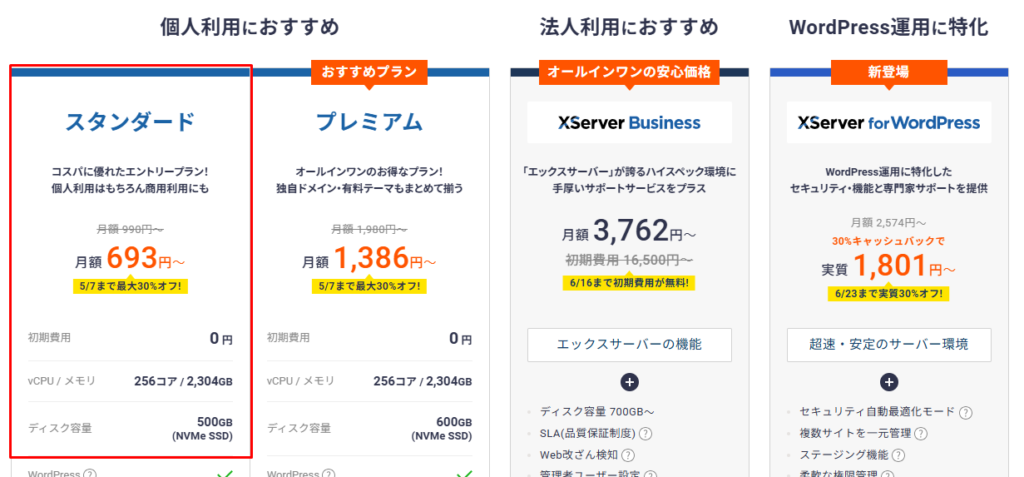 プランはスタンダードで全然大丈夫。不安ならWordpress特化プランも推奨するが月額約1,000円程度コストが高い。コストを抑えたいなら当サイトでも利用しているスタンダードで全く問題ない。